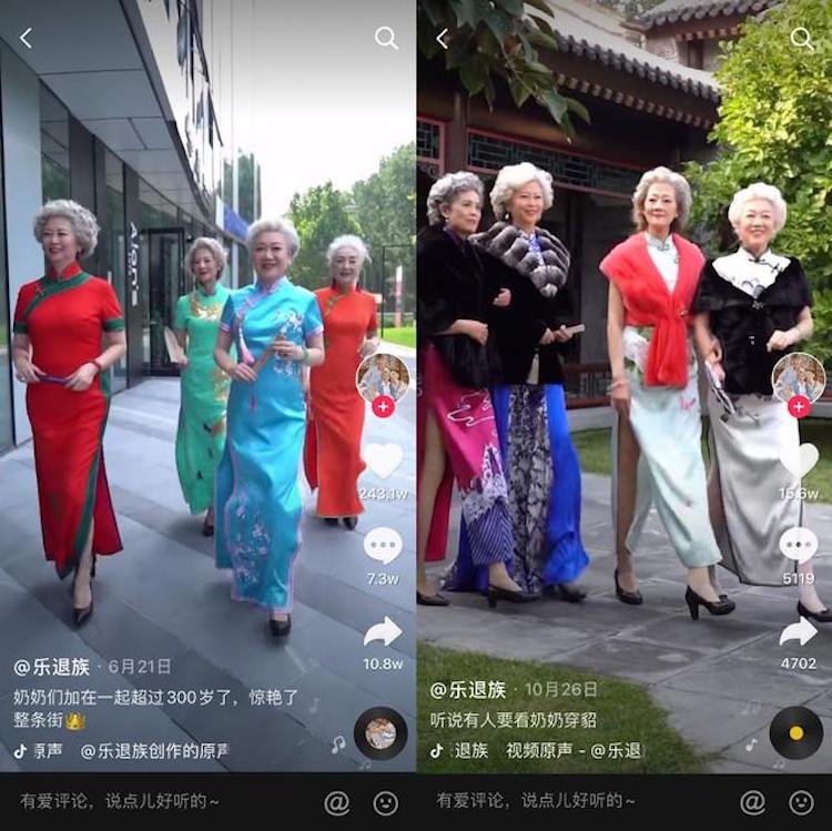伴随着短视频平台的崛起,乐退族显然不满足于只地做老年模特的培训和代理机构,其随后将旗下模特资源细化并组建老年KOL“分族”矩阵,在抖音为她们拍摄走秀、穿搭以及小品类内容。