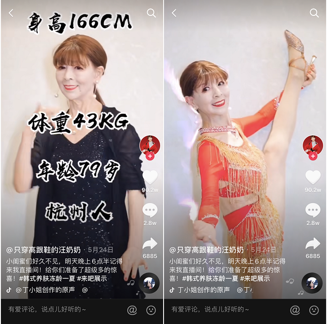 “只穿高跟鞋的汪奶奶”是抖音平台上最头部且商业化最成功的老年博主之一,目前有粉丝1582万。她凭借老年化演绎年轻人间流行的妆容、滤镜和说话方式走红,并得到了不少商业客户的青睐。