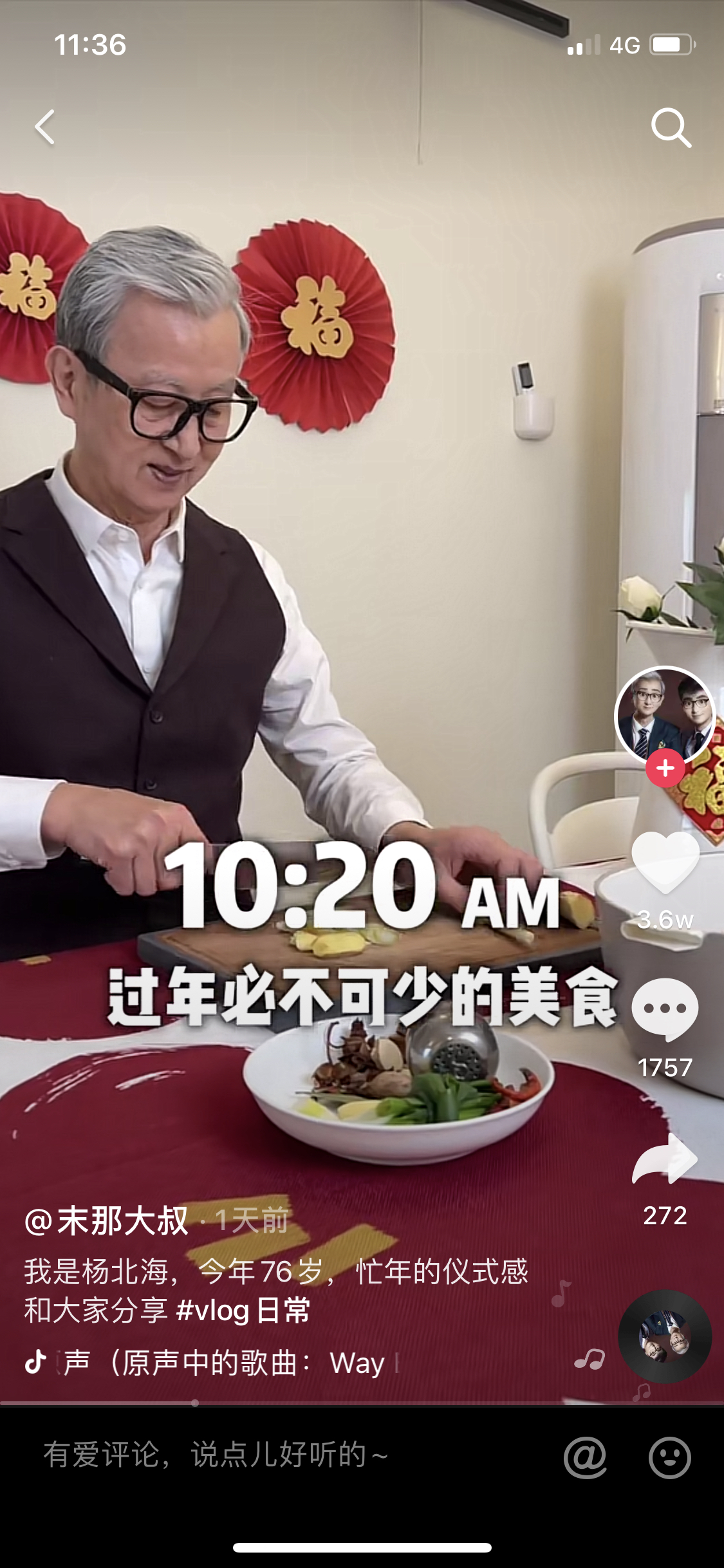 北海爷爷依然热衷于分享自己的真实生活。他最近发布了一则关于过年仪式感的短视频,展示了写福字、买金桔和烹饪清蒸鲈鱼等年俗日常。视频下,评论内容清一色都是粉丝对他送上的新年祝福。