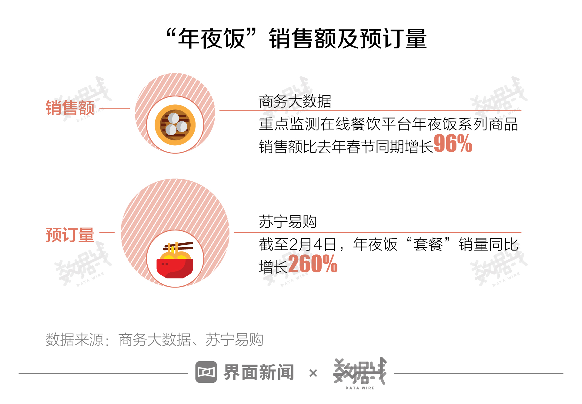 据商务大数据,自1月20日以来,重点监测在线餐饮平台年夜饭系列商品销售额较去年春节同期增长96%。截至2月4日,苏宁易购年夜饭“套餐”销量已同比增长260%。