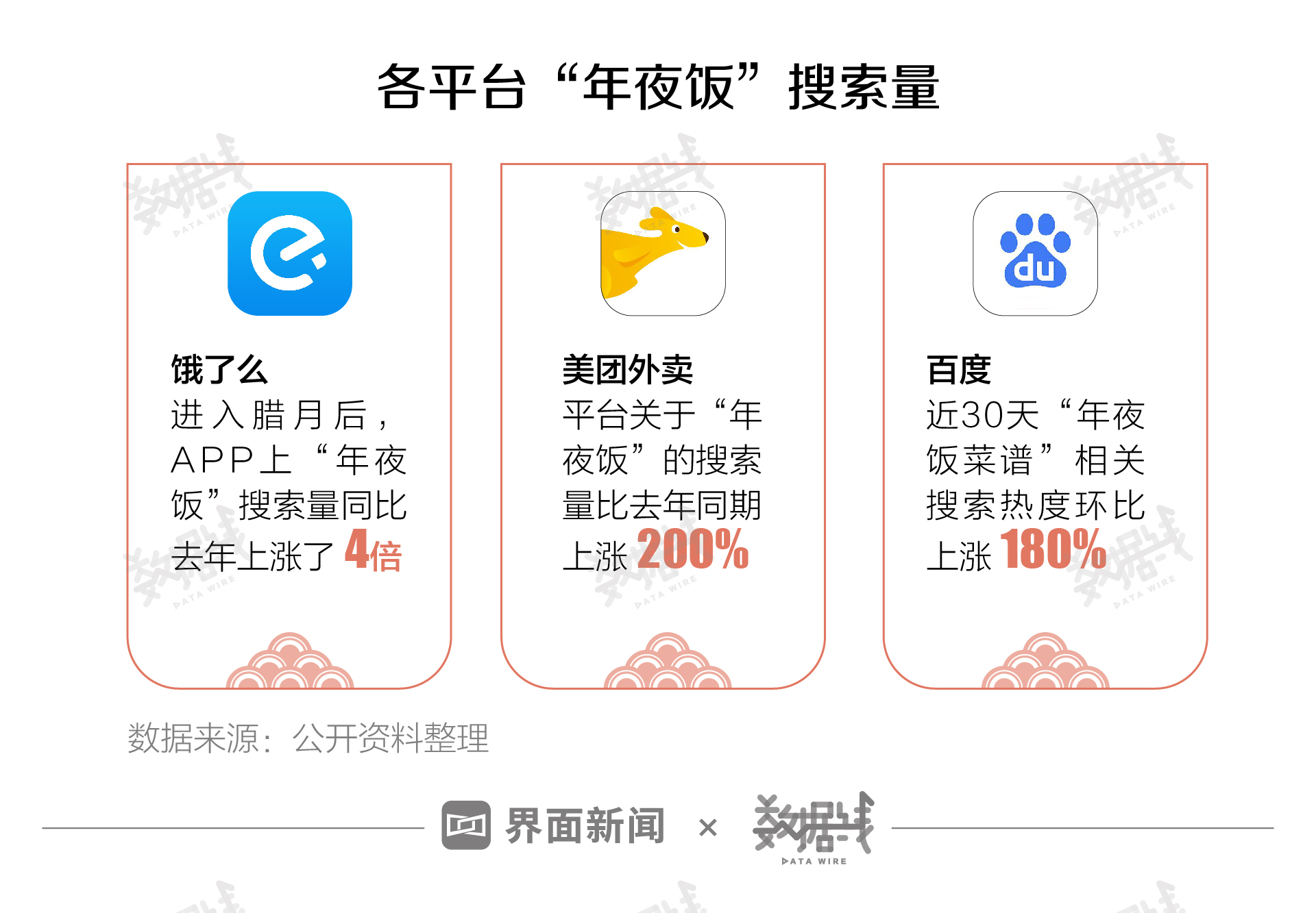 从关注度来看,百度、饿了么等多平台数据显示,“年夜饭”相关搜索在近期迎来暴涨。
