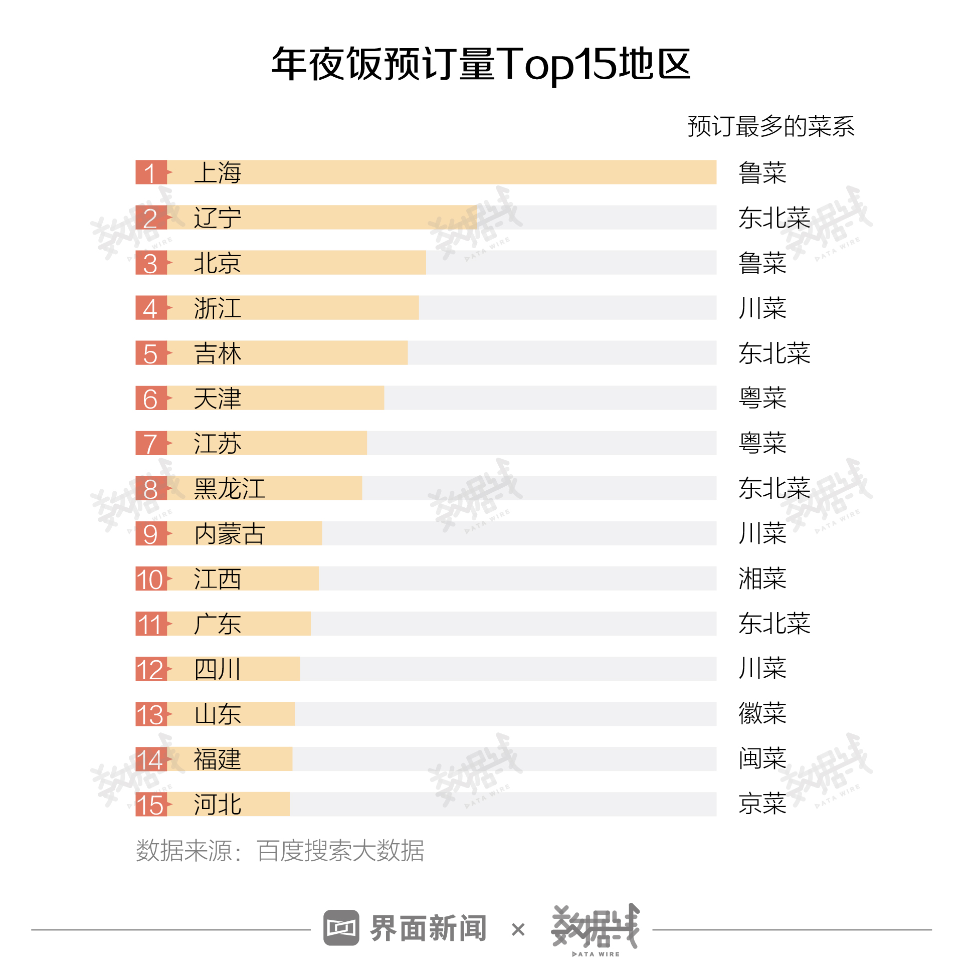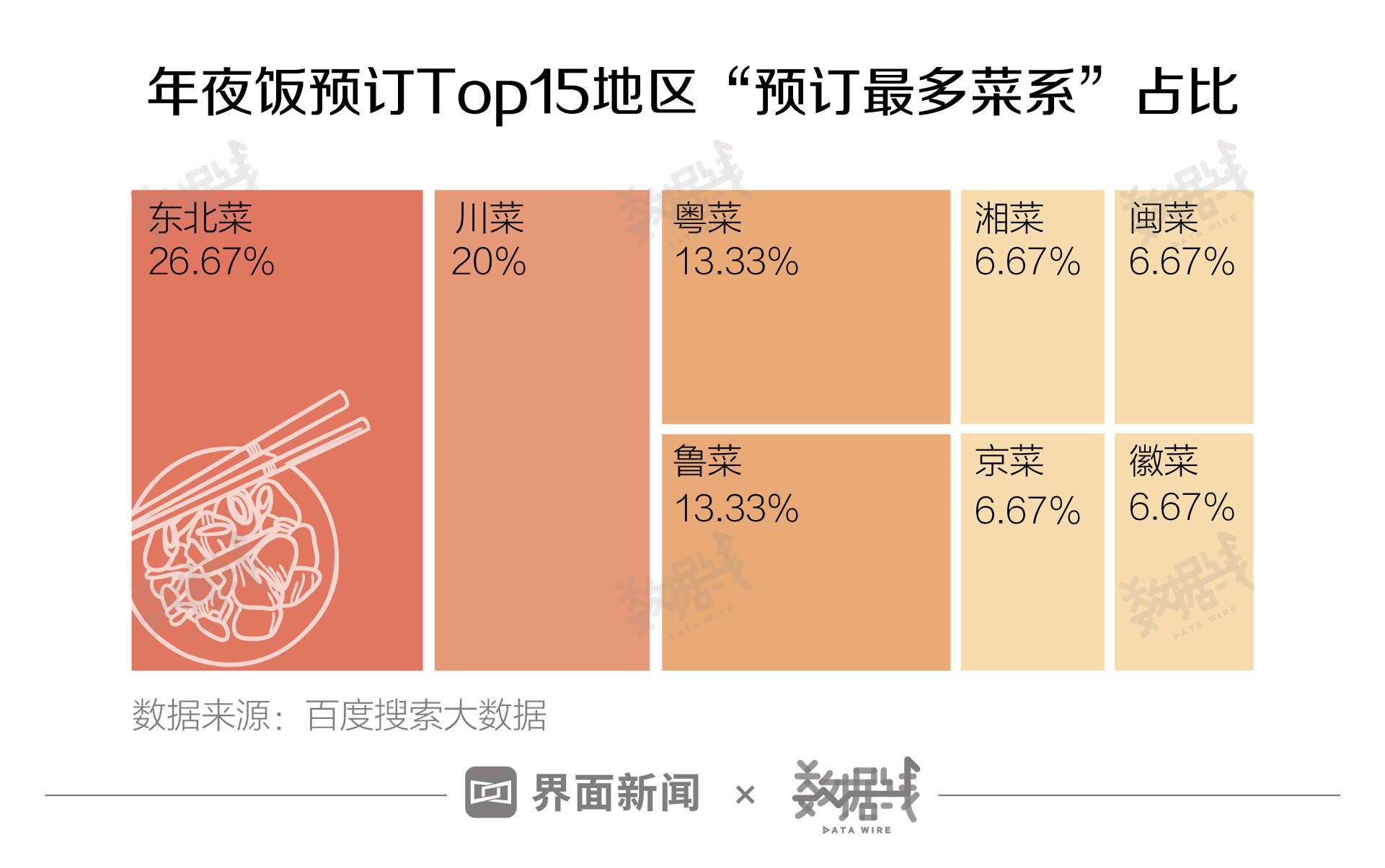 据百度搜索大数据,在年夜饭预订Top15地区“预订最多菜系”中,东北菜最多,占比达到26.67%,其次是川菜(20%)。