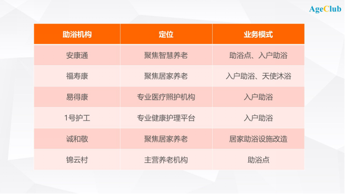 我们统计了目前市场上一些开设助浴服务的养老机构,发现老人助浴服务,往往被视为居家养老服务的一个细分类目,定位为养老机构的服务延伸,专门聚焦助浴服务的企业寥寥无几。