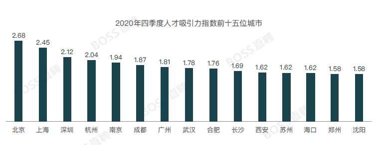 2020年第四季度,北京和上海的人才吸引力指数呈现较大优势,夺得第一梯队位置,深圳和杭州紧随其后。值得注意的是,南京在第四季度呈现了对高学历年轻人群良好的吸引力,在“人才质量”指标中分数较高,南京人才吸引力指数首次进入前五位。