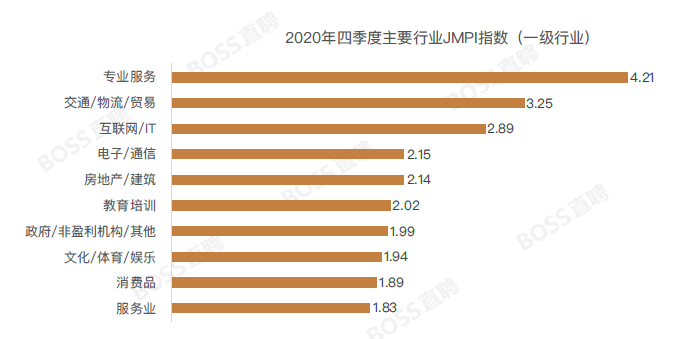 从行业来看,2020年四季度,就业市场繁荣指数(JMPI)前十的行业中,专业服务业(财务/法律/咨询等)JMPI指数升至4.21,连续三个季度位居第一,成为求职者最易获得理想报酬的行业。
