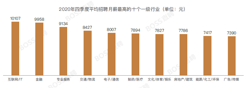 数据显示,各行业薪资差异波动明显。互联网/IT行业蝉联榜首,是统计的十个行业中唯一平均招聘月薪突破万元的行业;金融行业紧随其后,平均薪资同样逼近万元。