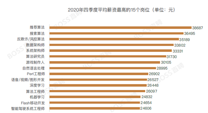 界面职场注意到,算法类岗位在2020年四季度平均薪资水平最高,在前15个均薪资最高的15个岗位中,算法类占据三分之一,其中最吸金的推荐算法岗薪资达到38687元,反欺诈/风控算法工程师岗位的平均招聘薪资环比增长9.4%,进入前三位。