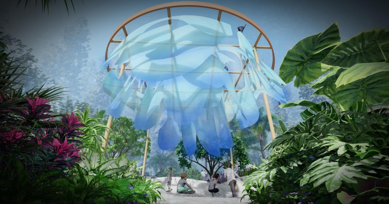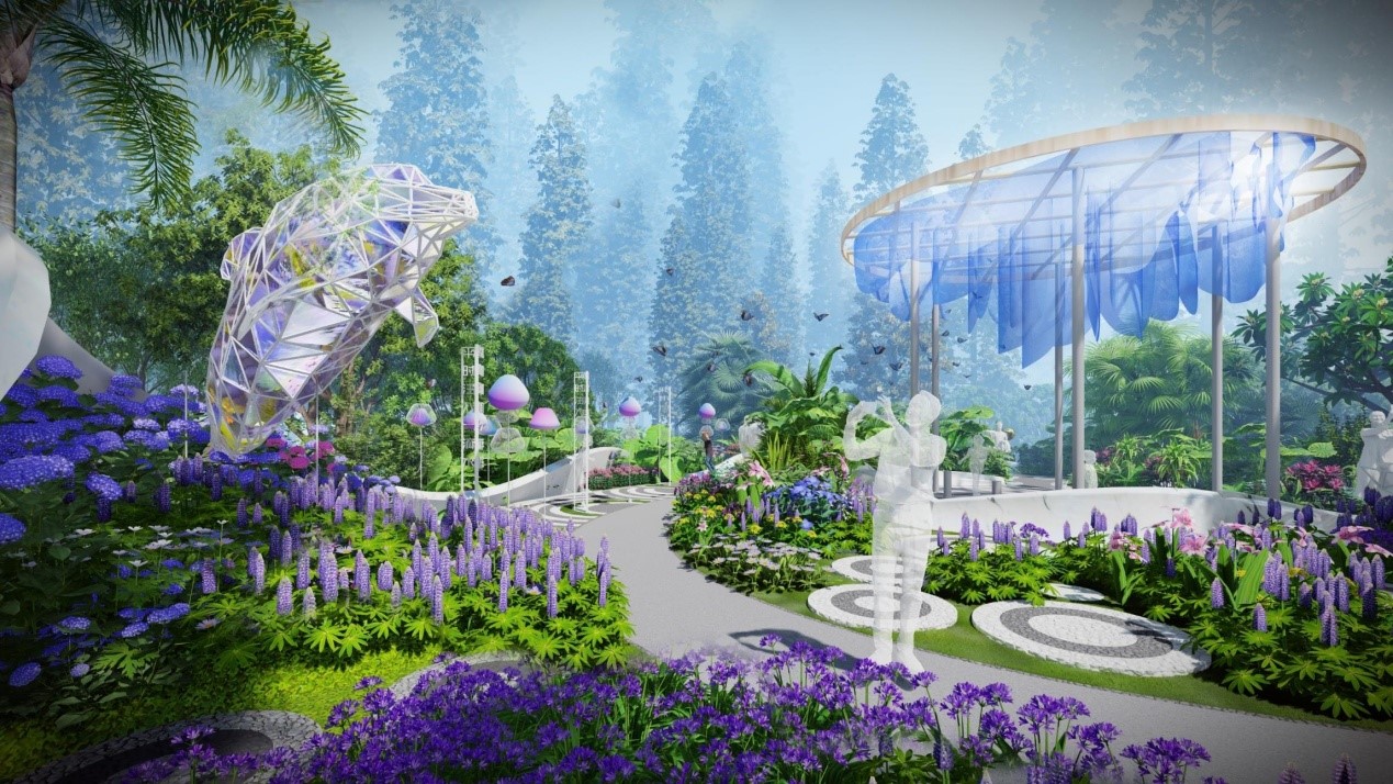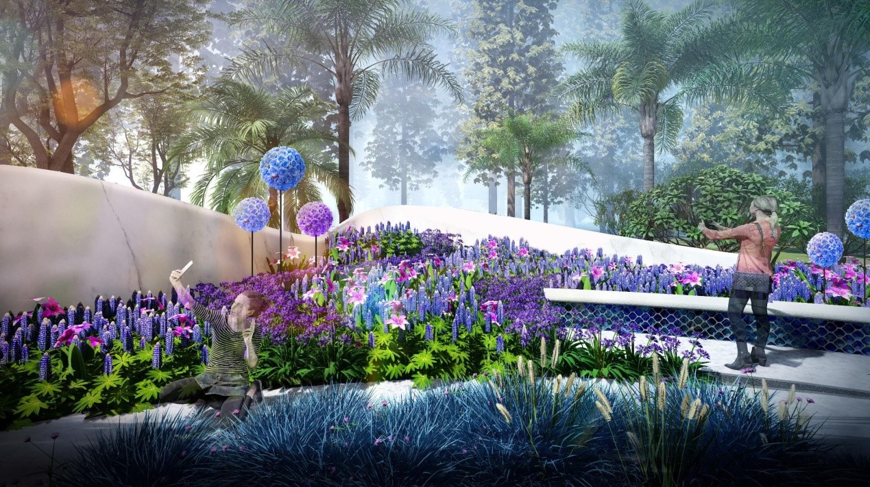 步移此处空间豁然开朗,一片大气绮丽的蔚蓝——是花也似海。雕塑化的海洋生物海豚悬浮在花海之中,好似徜徉于蔚蓝大海。数十种蓝色花卉集中种植于此,通过花园中多元素生态布置、多种文化趣味性表达、多样科技互动性展示给人们感受花园美丽的同时,让人们关注自然、保护生态环境。