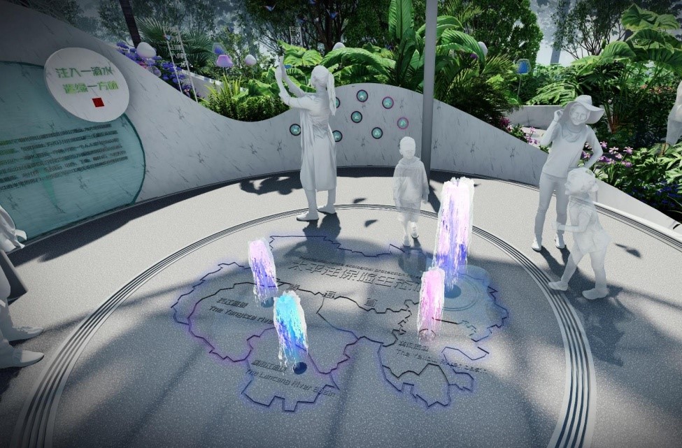 中心花亭,象征着中国太保为客户保驾护航,为促进社会和谐努力奋斗,绽放生命之花。花亭近看是花朵绽放,远看花瓣飘落似水滴雨落。在这里,水源、河流与三江源完美结合,参观者可通过触发感应装置与水景互动,通过二维码、景墙、地面上的文字了解中国太保为保护生态环境的责任担当。