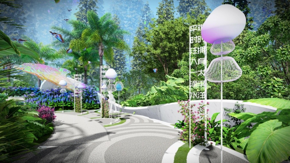 “太平洋保险花园”面积500平米,整个花园设计突出蓝色主基调,以与中国太保企业形象密切关联的水滴、海洋等形象为核心元素,通过动作、触觉、听觉、嗅觉、视觉的多感官调动,打造沉浸式的展示场景,唤起参观者对自然、生态环境的认知和感悟。让游人在花园中享受水的律动花的芬芳,收获欢乐和喜悦,在行走中体会中国太保的可持续发展价值理念。