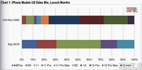 在更早之前,Morgan Stanley分析师也曾在报告点明,由于需求疲软,苹果方面将iPhone 12 mini的产量削减了200万台,并把重点放到在iPhone 12 Pro上。美国消费者情报研究(CIRP)发布的2020年iPhone 12系列全美销量报告中表明,iPhone 12 mini同样没有受到太多美国消费者青睐,其中iPhone 12是最为畅销的机型,占据了全部销量的27%,而iPhone 12 mini则仅有6%。