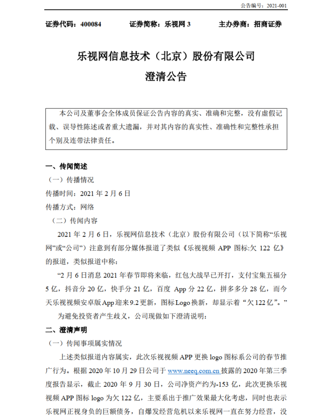 针对类似报道,乐视网2月7日发布澄清公告回应,证实类似报道内容属实。乐视网称,此次乐视视频 App更换 logo 图标系公司的春节推广行为。截止 2020 年 9 月 30 日,公司净资产约为-153 亿,此次更换乐视视频 App 图标 logo 为欠 122 亿, 主要系出于推广效果最大化考虑,同时也表示乐视网正视身负的巨额债务,自爆发经营危机以来乐视网一直在努力经营,没有放弃,深知公司所负的社会责任。
