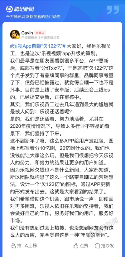 Gavin表示,自己是这次“乐视视频”App升级的策划。“我们最早是在朋友圈看到很多平台,App更新后,底部写着‘分红xx亿’,于是就把‘欠1122亿’这个点子发到了有品牌同事的群里,品牌同事考量了下,债务已经披露过,就觉得自嘲一下也不是坏事。目前是上线了安卓版,后续还会上线ios的,已经提交更新,正在审核中。”雷达财经了解到,截至2月8日,苹果应用商店中的乐视视频App也已经更新,出现“欠122亿”字样。
