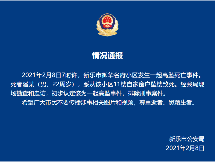 据“新乐警方”微信公众号消息,2021年2月8日7时许,新乐市御华名府小区发生一起高坠死亡事件。死者潘某(男,22周岁),系从该小区11楼自家窗户坠楼致死。经公安局现场勘查和走访,初步认定该为一起高坠事件,排除刑事案件。