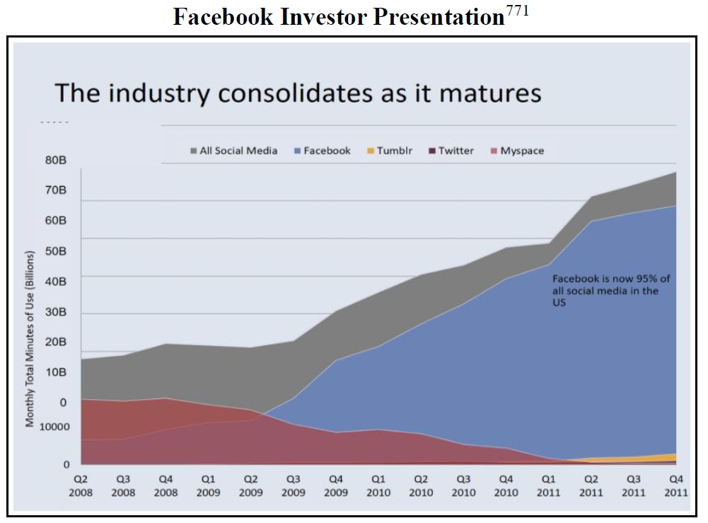 至少从2012年开始,Facebook公司的文件已显示其认为自己已经控制了社交网络市场较高份额。在为Facebook首席运营官Sheryl Sandberg准备的向一家大型电信公司所做的演讲稿中,Facebook表示,以月使用分钟数为参考系,与Twitter、Tumblr、Myspace以及所有其他社交媒体相比,它控制了美国“社交媒体市场95%的份额”。