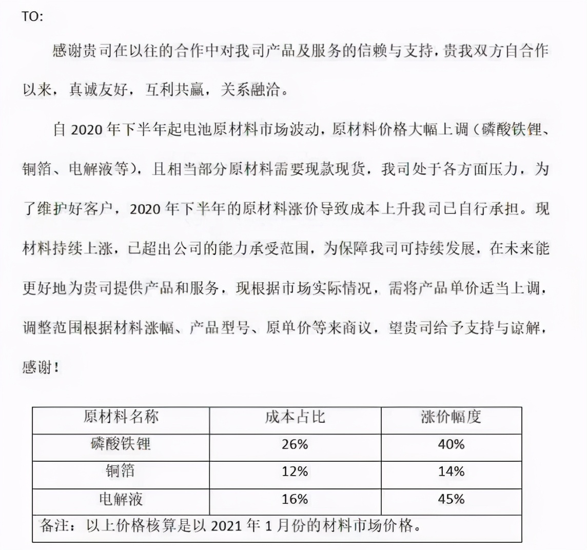 近斯,不少车企接到动力电池企业提价函。尤其磷酸铁锂电池,涨价约10%。一家动力电池企业在提到因为“原材料大幅上涨”,并称已经自行承担了2020年下半年的原材料涨价带来的成本压力,但无法承受2021年的继续上涨的压力。