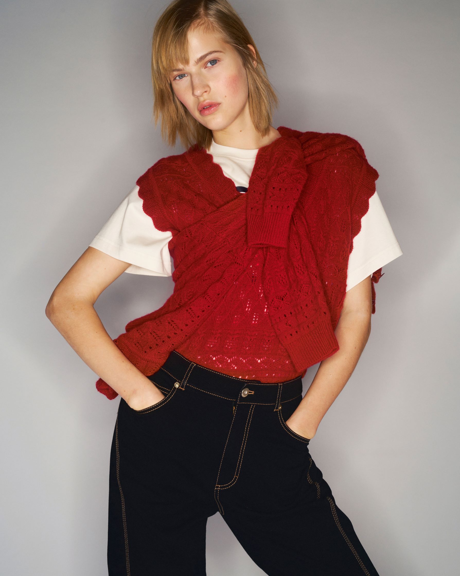 CARVEN卡纷将新年必不可少的红色战袍打造成了复古风格。对大红色外套没有兴趣的朋友,不妨考虑一下卡纷的这款荷叶边针织衫。羊绒材质带来舒适穿着体验,镂空设计和不扎眼的暗红色打造时髦复古感,还可通过内搭、外穿等穿法随意切换风格,新年穿红色也要穿成最靓的仔!