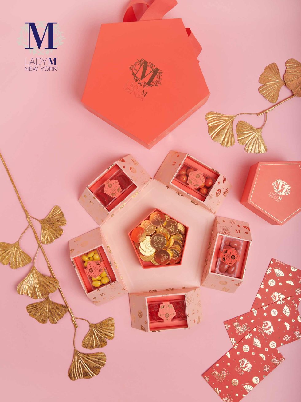 Lady M把今年的新春糖果礼盒做成了一朵“花”。礼盒以烫金线条勾勒出金牛、炮竹燃放的新春景象。礼盒中含六款糖果,中间还有金币巧克力,非常适合新春和家人一起分享。