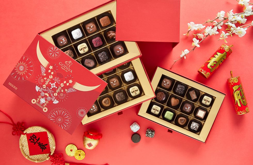 GODIVA歌帝梵今年的新年巧克力很适合送礼,金红色的生肖包装非常喜庆。歌帝梵此次礼盒内含香橙覆盆子白巧克力、榛果蓉牛奶巧克力及杏仁慕丝黑巧克力,且一口气推出了多款礼盒,包括新年片装巧克力礼盒15片和28片装,9颗、18颗装、22颗装、28颗、36颗装,以及单独一款10颗装的新年松露巧克力铁盒。
