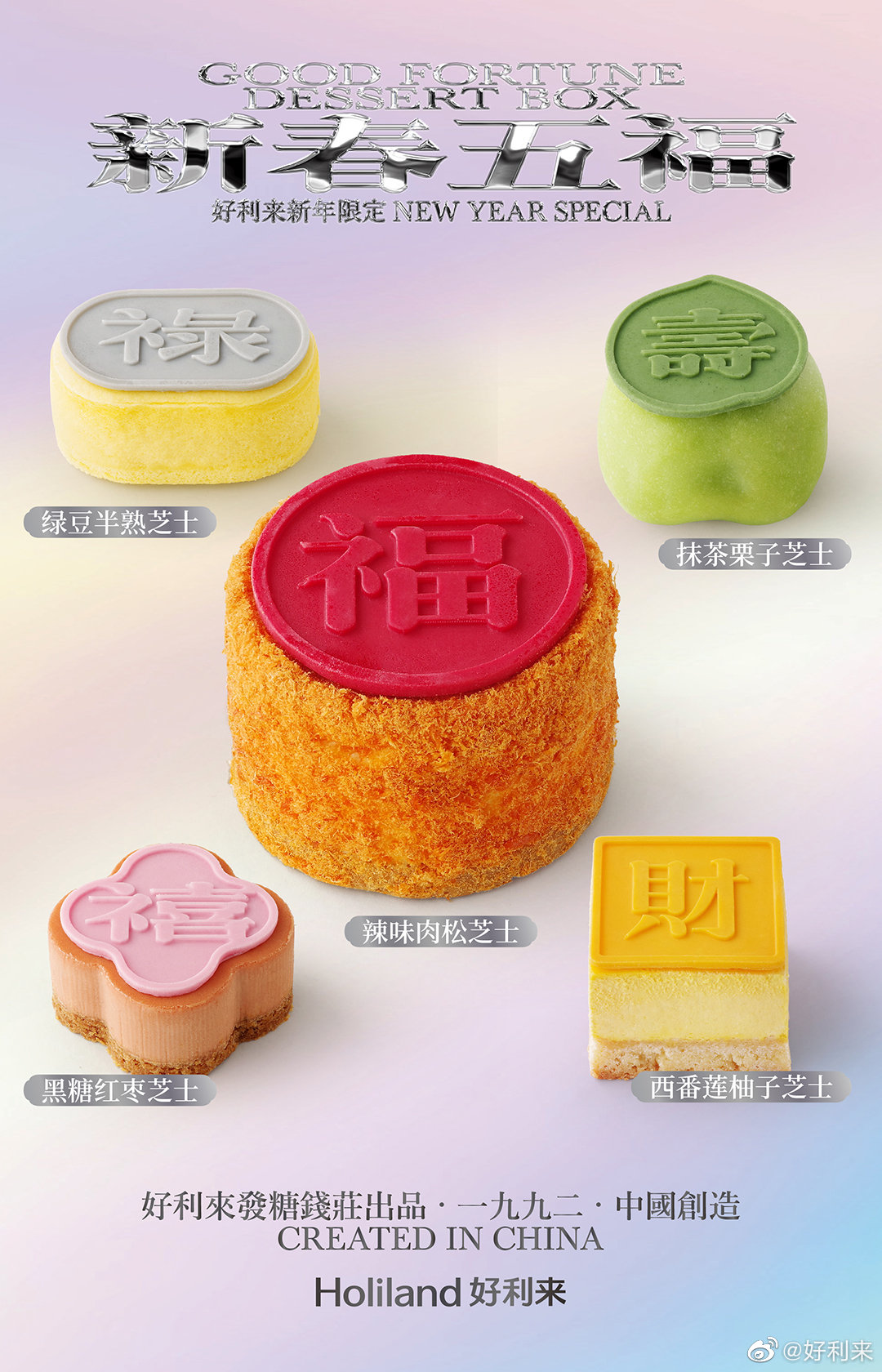 新春享用美食也要讨个好彩头。好利来今年不止出新春糕点,还要送五福红包和春联!全新推出的五福芝士分别以“福、禄、寿、喜、财”为主题,既是新春必备伴手礼,也是和家人一同分享的甜蜜。五种口味包括:绿豆半熟芝士、抹茶栗子芝士、辣味肉松芝士、黑糖红枣芝士以及西番莲柚子芝士。在门店消费还可获得红包或春联。