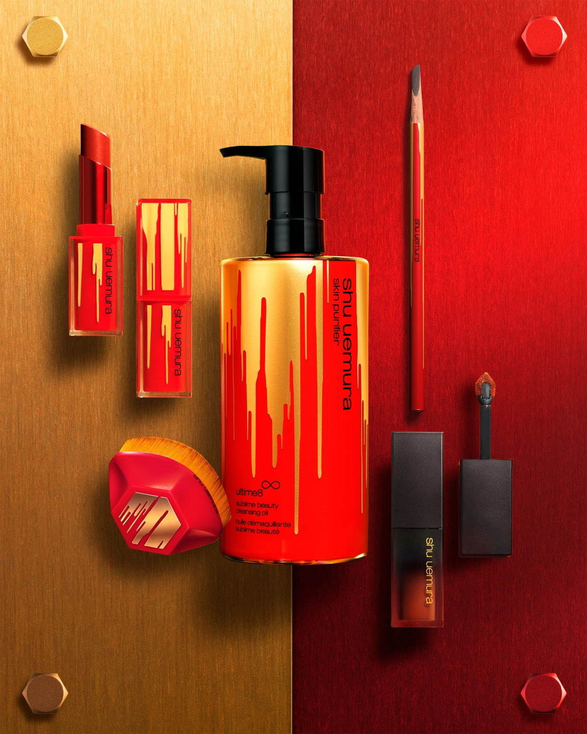 从护肤品到彩妆都要从“新”开始。植村秀的多款人气单品也都换上了金红的锦鲤色包装, 比如新年限定的琥珀养肤洁颜油,锦鲤红以及锦鲤咖唇膏。55号粉底刷和砍刀眉笔也都换上了锦鲤包装。护肤和彩妆整套组合送礼也是不错的选择。