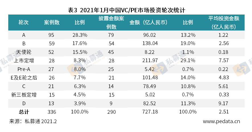 根据清科旗下私募通数据统计,2021年1月中国股权投资市场共发生投资案例336起,环比下降47.9%,同比下降27.3%,其中披露金额的案例290起,共涉及投资金额727.18亿元人民币,环比下降41.3%,同比上升101.1%,单笔投资金额为2.51亿元人民币,环比上升15.0%,同比上升178.8%。2020年上半年受到新冠疫情影响,投资进度大幅放缓,下半年投资活跃度回暖,2020年投资市场整体呈现走高趋势。从投资金额同比角度来看,2021年1月延续2020年以来的上升趋势。