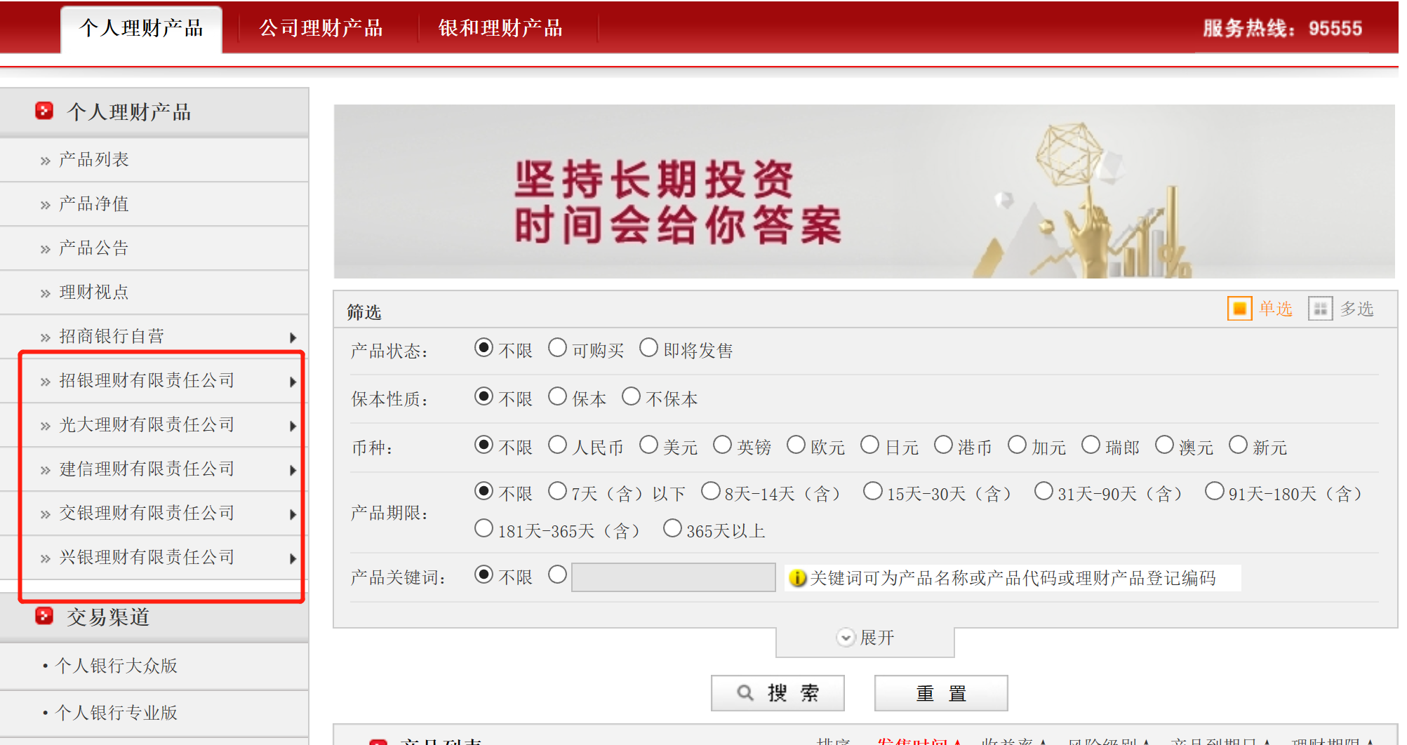 界面新闻记者发现,目前微众银行、网商银行等互联网银行销售的理财子公司产品已“不见踪迹”,而多家银行理财子公司已在母行官网或app上代销他行理财子产品。如招商银行官网的个人理财产品一栏已单独列出光大理财、建信理财、交银理财、兴银理财等公司的理财产品。