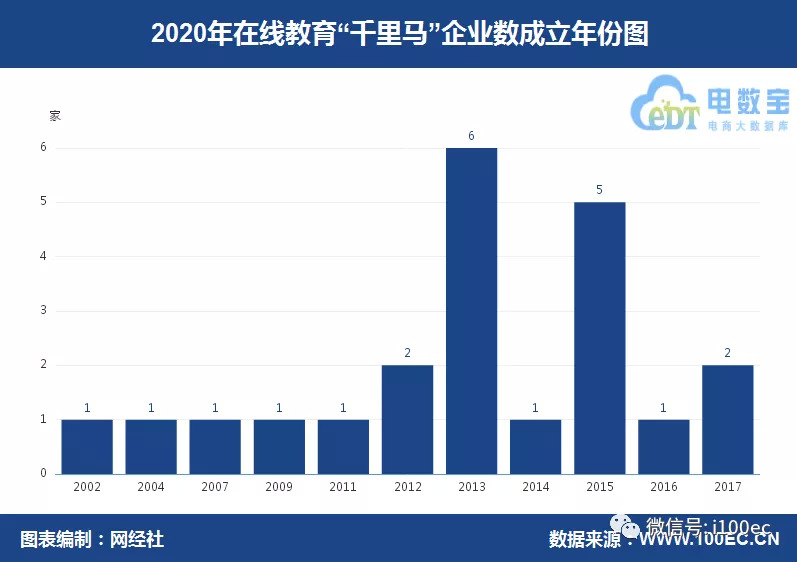 从在线教育“千里马”成立时间看,大都成立在2012年至2015年之间。其中2013年成立的“千里马”企业最多,有6家,其次为2015年成立5家。