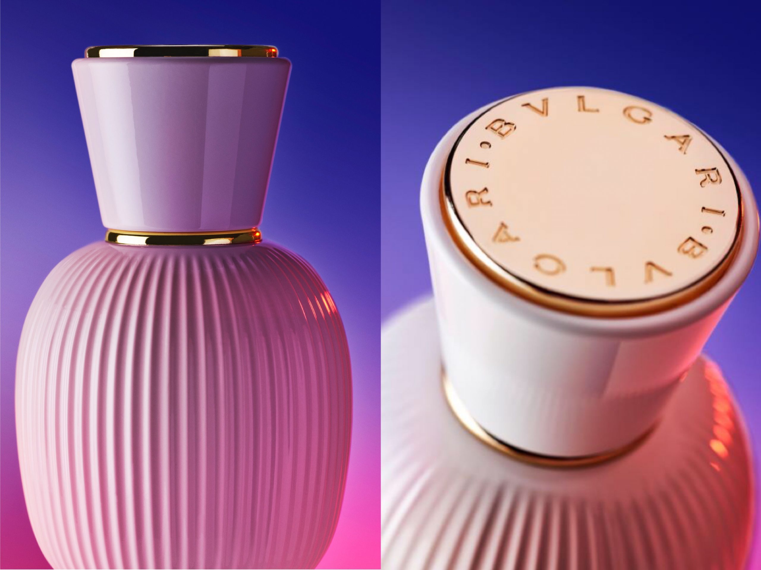 瓶身造型以品牌著名的蛋面切割宝石为灵感,传递出珠宝般的雕塑工艺;同时,嵌入饰纹瓶盖与底座之间的凹槽,象征宝格丽诞生地——罗马标志性的石柱。