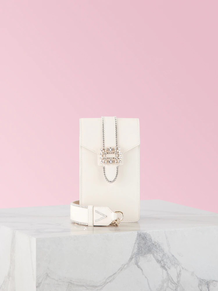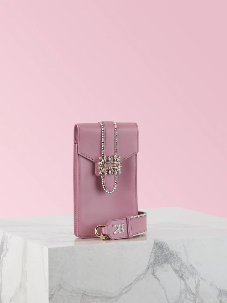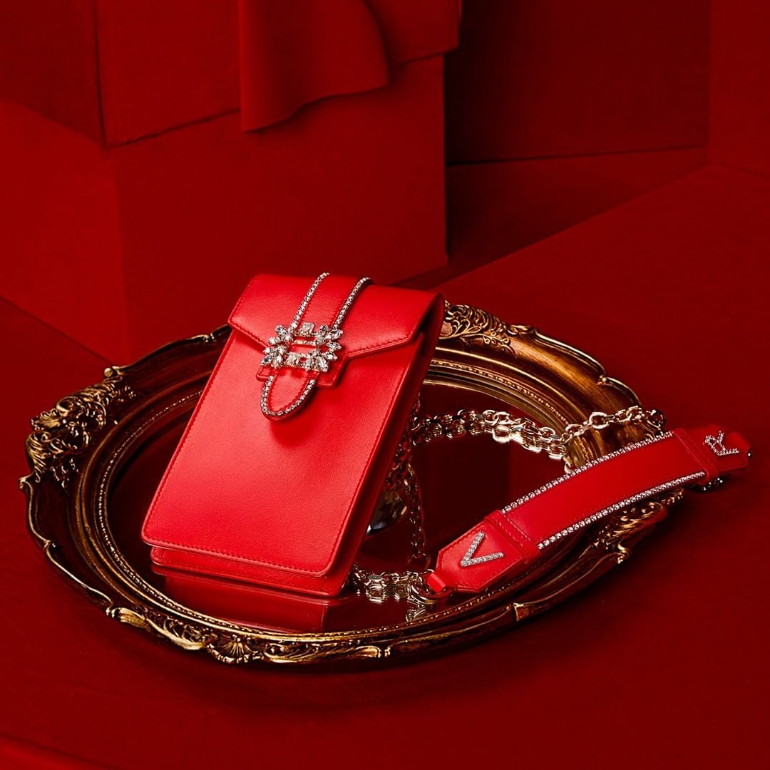 由创意总监Gherardo Felloni操刀的2021春夏系列一改经典的方扣设计。Bouquet迷你手包、Strass Buckle高跟鞋、Flower Strass手镯等都换以华丽的镶钻设计。本季这款大热的手机包也配以凡尔赛闪钻饰扣,肩带两侧的RV字样也以闪钻镶嵌,和牛皮材质相映衬,简约而不失质感。
