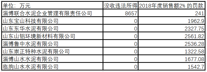 处罚决定显示,这八家涉案企业依次为淄博联合水泥企业管理有限公司、山东宝山科技有限公司、山东东华水泥有限公司、山东山铝环境新材料有限公司、淄博鲁中水泥有限公司、山东崇正特种水泥有限公司、淄博山水水泥有限公司、临朐山水水泥有限公司。