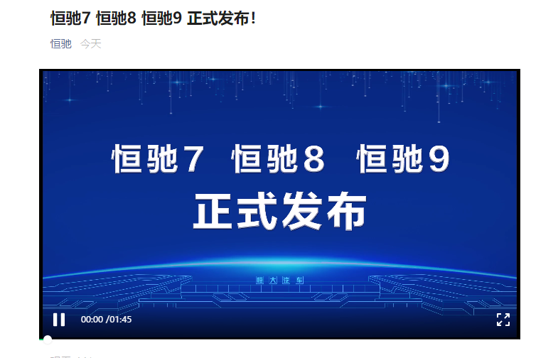“恒驰”微信公众号2月10日早间发布一则短视频,宣布正式发布恒驰7、恒驰8、恒驰9三款车型。