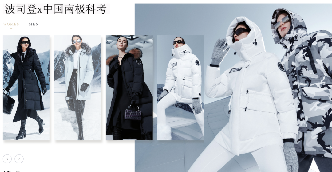 2020年11月,波司登宣布联合中国南极科考队,共同参与研发设计,推出使用稀有鹅绒、Gore-Tex 面料等原材料的专业保暖系列。对接科考、户外、运动、出行等不同保暖需求,专业保暖系列包含登封、滑雪、高端户外、极寒四个子系列。
