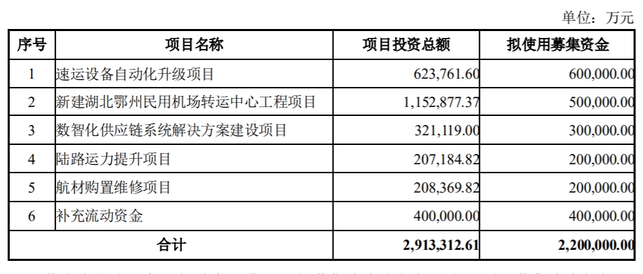 220亿的定增方案中,顺丰拟将60亿用于速运设备自动化升级项目,50亿用于新建湖北鄂州民用机场转运中心工程项目,30亿用于数智化供应链系统解决方案建设项目,20亿用于陆路运力提升项目,20亿用于航材购置维修项目,其余40亿补充流动资金。