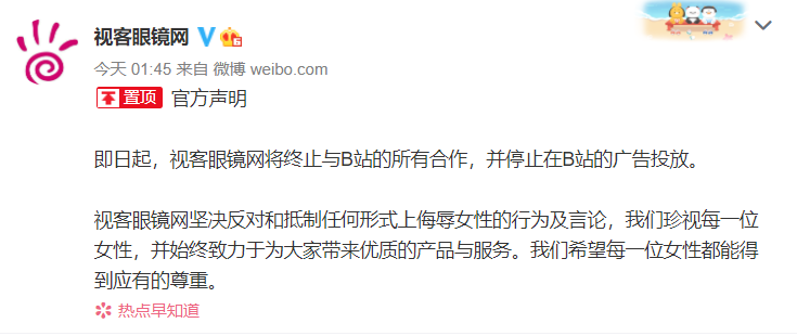 同日,@视客眼镜网 微博也声明称,“即日起,视客眼镜网将终止与B站的所有合作,并停止在B站的广告投放。视客眼镜网坚决反对和抵制任何形式上侮辱女性的行为及言论,我们珍视每一位女性,并始终致力于为大家带来优质的产品与服务。我们希望每一位女性都能得到应有的尊重。”