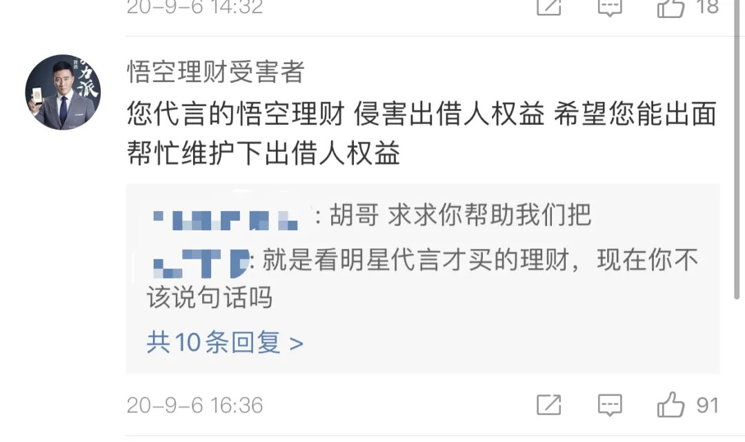 因此,P2P爆雷受害者对明星的态度往往是求助和诉苦,而非追偿。在胡军去年9月宣传综艺节目的微博下方,受害者们纷纷评论,“希望您能出面帮忙维护下出借人权益”、“胡哥,求求你帮帮我们吧”。