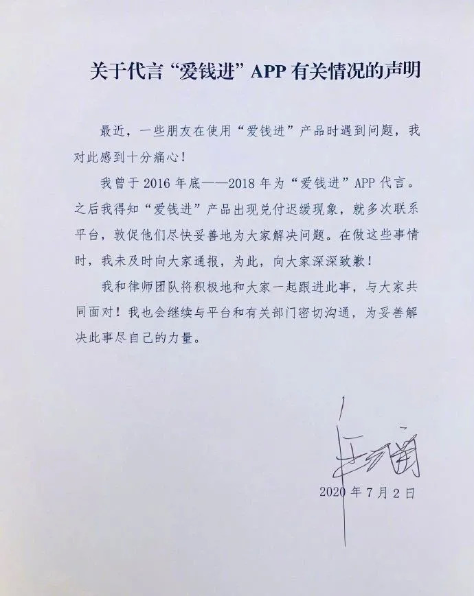 去年7月,爱钱进APP涉嫌非法吸纳公众存款而被立案侦查,受害人达到37万,被骗总额230亿。随后,爱钱进的前代言人汪涵发布声明称,他曾经知悉产品的兑付出现迟缓,也多次联系平台敦促解决问题,但并未及时向公众通报,并对此进行道歉。