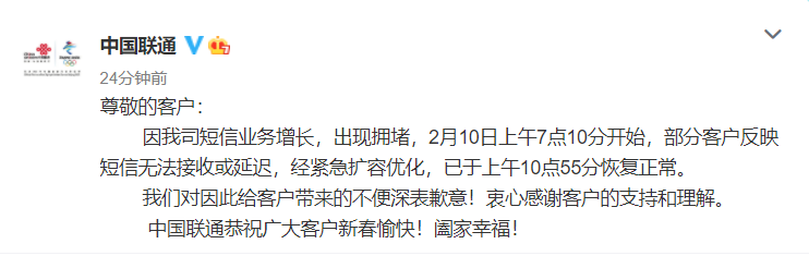 2月10日,中国联通通过其官方微博对此前“短信无法接收或延迟”一事回应称,“因我司短信业务增长,出现拥堵,2月10日上午7点10分开始,部分客户反映短信无法接收或延迟,经紧急扩容优化,已于上午10点55分恢复正常。”