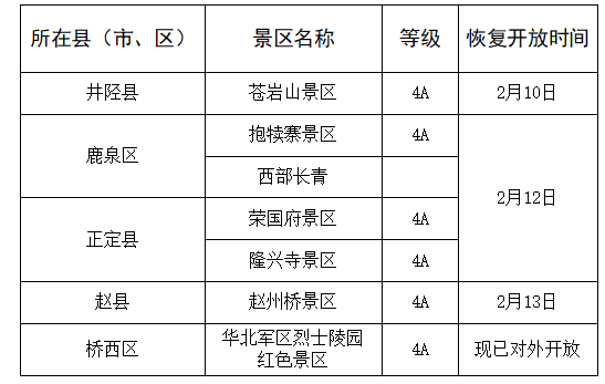 据河北日报消息,2月10日,石家庄市文化广电和旅游局发布关于恢复开放低风险地区部分旅游景区的通告,根据通知低风险地区部分旅游景区(第一批)即将恢复开放。其中要求自然山水类和人文景观类旅游景区只开放室外部分,溶洞类景区暂不开放。恢复开放的A级旅游景区严格执行预约、错峰、限流入园,认真做好游客二代身份证识别和登记工作,接待游客量不超过景区最大承载量的50%。