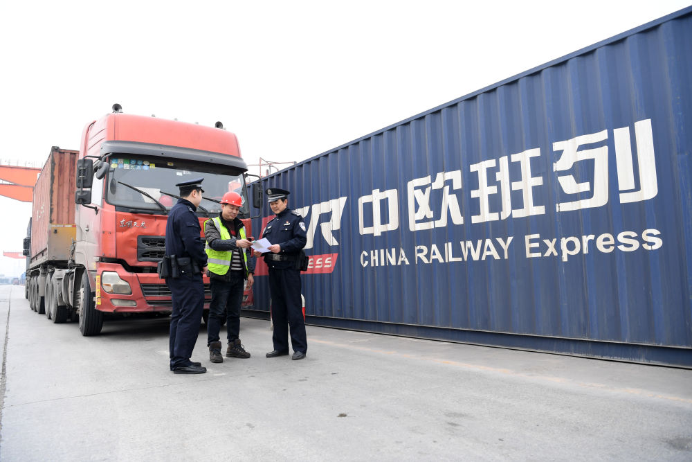 春运期间,中欧班列的运输任务仍旧繁忙,2021年2月8日,民警雷激(右一)和同事在重庆团结村中心站货场对货车进行例行安全检查。重庆团结村中心站是中欧班列(渝新欧)起点站。开行10年以来,中欧班列(渝新欧)累计开行超7000列。(新华社记者唐奕摄)