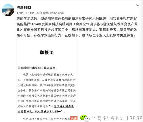 1月20日,家电业爆出一条大新闻,严格地说,是一场舆论大战的前戏。一位注册名为“陈进1982”的微博用户,在其微博发布了一封《举报函》,实名举报“美的”学术造假,欺骗有关部门和消费者。