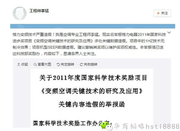 就在陈进举报“美的”的第三天,一位注册名为“工程师李猛”的微博用户通过其微博账户发帖,举报“格力”2011年获得的国家科技进步奖——《变频空调关键技术的研究及应用》项目涉嫌造假。