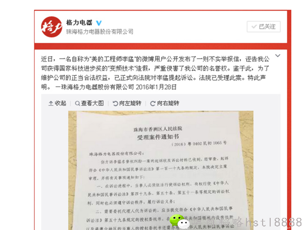 后经查实,“工程师李猛”实为“美的”员工李猛。他的这个动作,也直接让两家企业的战斗升级并公开化:1月29日上午,“格力”宣布,为维护名誉,公司已在总部所在地珠海香洲区法院起诉美的工程师李猛。而“美的”也毫不示弱,于当天下午宣布自己已在佛山市顺德区法院对格力的陈进提起了诉讼。