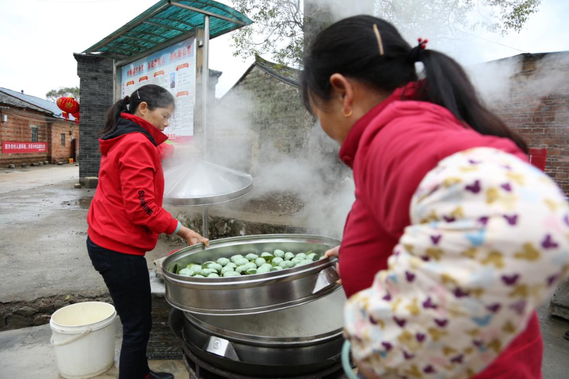 2月10日一大早,临桂区四塘镇下舍里村一片热闹场景,村民们正在打扫进士门前的小广场。在小广场的另一边,下舍里村的妇女们在忙着做粑粑,大家有说有笑,忙得不亦乐乎。