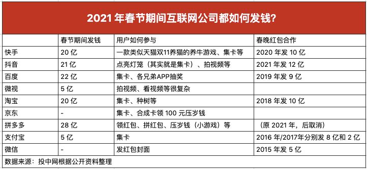 自此之后,为争夺春晚红包的合作机会,互联网公司都愿意广撒钱。过去五年间,依次与春晚红包合作的分别有:支付宝、淘宝、百度、快手。它们通过发红包互动方式增加用户规模,比如2019年百度日活从1.6亿冲上3亿、2020年快手完成了DAU到3亿的KPI。这个期间,不仅合作的主APP收益,它还携带“全家桶”的业务集中在此聚光灯下:要拿更多红包,先下载我其他的APP。