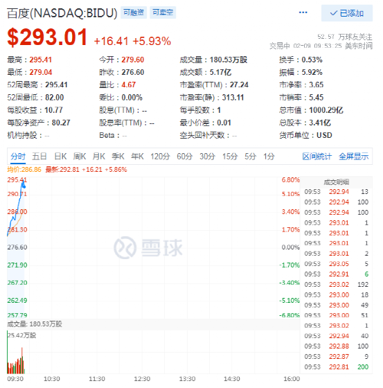 在过去一年中,百度的股价在触底反弹后开始了刷新之路,一年间股价从低点一路飙升,涨幅高达220%。在2月9日,百度股价创下304.24美元的新高,市值突破千亿美元大关。