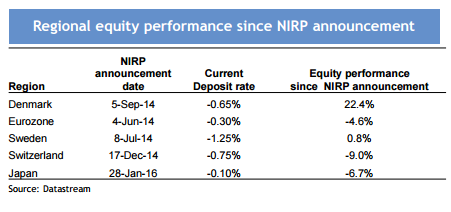 负利率政策近来饱受批评和质疑。市场认为,负利率加剧了所谓的全球货币战争,挤压了银行收入。它实际上并没有放松,反而收紧了信贷环境。摩根大通分析师周一称,总体来讲,负利率对股市起到反作用。自欧洲、瑞士和日本引入之后,它们的股市均出现下跌。
