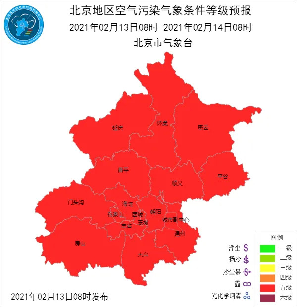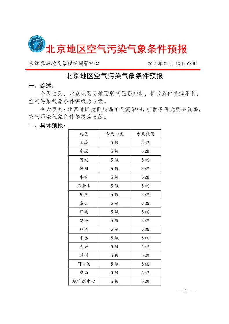 北京市气象局官方微信公众号2月13日发布今天白天到今天夜间北京地区空气污染气象条件预报:今天白天,扩散条件持续不利,空气污染气象条件等级为5级。今天夜间,扩散条件无明显改善,空气污染气象条件等级为5级。