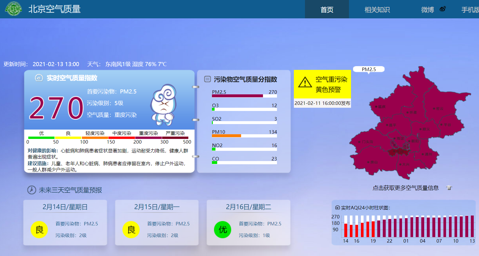 另据北京市生态环境监测中心官方今日13:00更新的数据显示,实时空气质量指数为270,污染级别为5级,空气质量为重度污染。