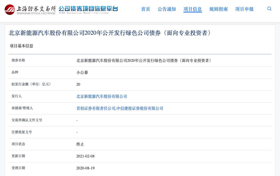 2月13日消息,据上交所披露,北京新能源汽车股份有限公司2020年公开发行绿色公司债券(面向专业投资者)的项目状态更新为“终止”,更新日期为2021年2月8日。项目信息显示,该债券品种为小公募,发行人为北京新能源汽车股份有限公司,承销商/管理人为首创证券有限责任公司、中信建投证券股份有限公司。
